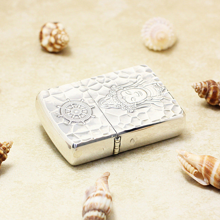 This Zippo lighter features a heavy, Textured Silver Plated base which resembles hammered metal or rock. The front surface is adorned with a detailed Deep Relief Carving of the head and headdress of Guanyin (Avalokitesvara Bodhisattva), the Buddhist deity of compassion, who is often depicted wearing a crown. Above the figure is a symbolic Dharma Wheel. The combination of the rough texture and the serene, iconic figure creates a powerful spiritual aesthetic. This piece belongs to the Spiritual/Character Series.